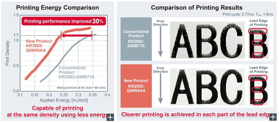 这些改进使得KR2002-Q06N5AA在使用单个锂离子电池时,就能达到与传统2节锂离子电池(7.2V)驱动打印头相同的打印速度和质量。与现有的单电池驱动热打印头相比,KR2002-Q06N5AA将打印所需的应用能量降低了约30%,实现了更高的能源效率,同时减小了热敏打印机设备的尺寸和重量。